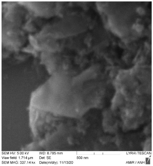 The printed circuit board on which the transmission line is present was fabricated with the help of a photolithographic process. The pattern of the transmission line structure is printed with a photoresist on a dual copper-plated dielectric substrate. The unwanted areas lying outside the structure are etched away by ferrous chloride solution. The graphene nanoplatelets used in the transmission line were provided by Alfa Aesar GmbH. The nanoplatelets were characterized by scanning electron microscopy (Tescan Lyra3 FEG) and atomic force microscopy (JPK nanowizard), to investigate their quality and thickness. Figure 6 shows the atomic force microscopy characterization of the multilayered graphene. It can be seen that the flakes in the graphene network are irregularly shaped. In the measurement of the cross-sectional view of the graphene flake (Figure 6b), it can be seen that the thickness of the graphene is equivalent to more than two graphene sheets. An SEM image of the graphene flakes is shown in Figure 7. The measurement was performed with an acceleration voltage of 5 KV. The sharp edges of the graphene flakes are visible in the SEM image. It can be further seen that the graphene flakes form a network in the bunch of the flakes that are to be deposited on the PCB. The graphene nanoplatelets were mixed in isopropyl alcohol and then drop cast in the designated spots on the transmission line. The isopropyl alcohol evaporates, leaving behind the graphene nanoplatelets suspended in the gap, forming a network.