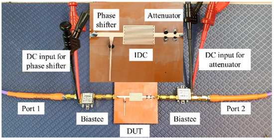 The measurement setup of the amplitude-phase variation transmission line is shown in Figure 8. It is composed of a vector network analyzer (Rhode Schwarz ZVA 24) connected to bias tees and the device under test (DUT). The VNA is calibrated at the ends of the bias tees, in order to remove any impact of the bias tees on the measurements.