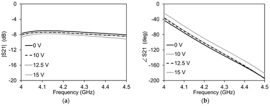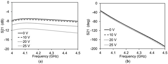 Measurements of the phase shifter mode of the transmission line with Vg = 0 V for all cases: (a) Amplitude variation; (b) Phase variation.