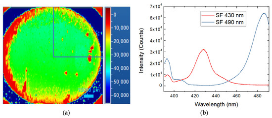 Only a quarter of the wafer was used for the oxidation process, in particular the area delimited by the blue lines in Figure 1a. In this quarter, just two kinds of SFs are present, at 430 and 490 nm of wavelength (Figure 1b), but we cannot see the presence of carbon vacancies directly.