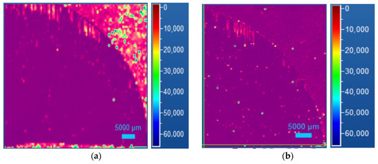 Photoluminescence map of the same quarter of the 4H SiC wafer highlighted in Figure 1a, before (a) and after (b) oxidation process.