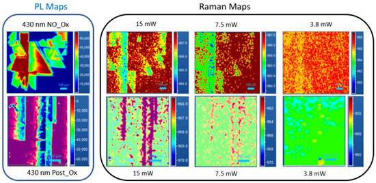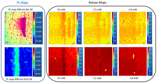 PL and Raman maps of an isolated defect at 430 nm No_Ox (upper strip) and Post OX (lower strip) for different induced carrier values related to the laser power used (15–7.5–3.8 mW, respectively) following the LO peak position.