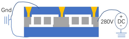 Anodic bonding was used to realize the packaging of the tilt accelerometer. When bonding, a three-layer bonding method was used. A positive voltage of 280 V was applied to the silicon structure, and the glass substrate and the TGV cover were grounded, as shown in Figure 6. An excessively high bonding voltage was likely to cause the structure to be adsorbed upward or downward on the glass cover. To ensure bond quality at low voltages, good plasma cleaning of the structure and cover was required. Finally, the interconnection between different electrode groups was achieved through metal traces.