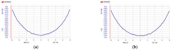 A CV test was carried out on the device using Keysight’s B1500, and the test results are shown in Figure 8. The structure of the device on the test surface had a good response to the electrostatic force, the etching and release process of the device was good, and the device was intact and free of adhesion. The capacitances between the mass and the positive and negative electrodes were about 5.52 pF and 5.32 pF, respectively. Considering the parasitic effect, the design value was consistent with the measured value. The differential capacitance deviation caused by the process was only 3.7%.