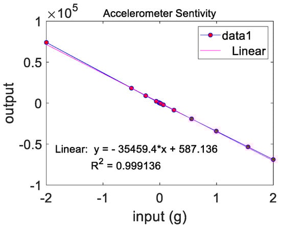 The capacitance detection was realized through a dedicated ASIC with digital output. The sensitivity of the accelerometer was tested on a centrifuge. The test results showed that the prepared accelerometer had good linearity in the range of plus or minus 2 g. The sensitivity of the accelerometer was 35,459.4 bits/g, and the corresponding sensitivity was about 28.2 μg/bit, which had high detection accuracy, as shown in Figure 9.
