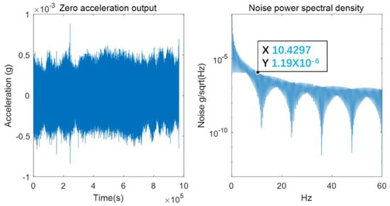 The accelerometer output was continuously sampled at 120 Hz for more than two hours when the input was zero, and the result is shown in Figure 10. The corresponding RMS noise was about 163.8 μg, the corresponding tilt noise was 0.0094°, and the noise density near 10 Hz was about 1.2 μg/√Hz, the test results are shown in Figure 10.
