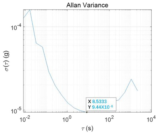The Allan deviation of the accelerometer was calculated, and its zero-bias instability was 9.4 μg, which showed that the device has excellent performance as an inclination detection accelerometer, as shown Figure 11.