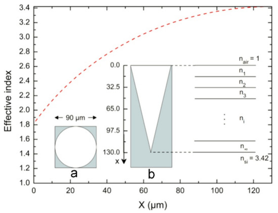 Schematic diagram of multilayer graded index of refraction for a single inverted cone structure and effective index for different vertical distances x, (a) Top view and (b) longitudinal section [61], Copyright © 2016 Elsevier.