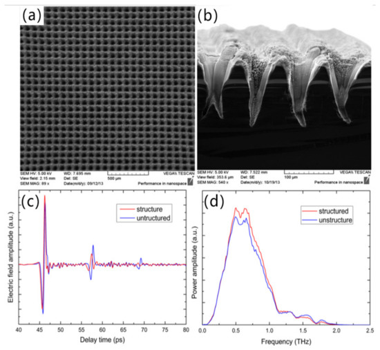 (a) Topping view and (b) Crossing sectional view of the inverted cone-shaped structure arrays with a period of 90 μm on a high-resistance silicon substrate by SEM; (c) Time-domaining signal and (d) Frequency-domaining spectrum of inverted conical structure sample [61], Copyright © 2016 Elsevier.