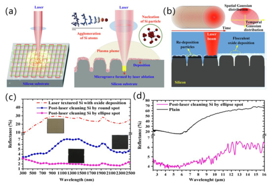 (a) Laser ablation kinetics of micro/nanostructure growth paths and deposition on silicon substrates; (b) Schematic diagram of round dot laser cleaning oxide deposition; (c) Reflectance spectra of textured silicon surfaces in the range of 300–2500 nm; (d) Reflection spectra of micro/nano-construction fabricated by laser cleaning assisted laser ablation irradiation and unprocessed silicon within MIR region (2.5–16 μm) [89], Copyright © 2020 Elsevier.