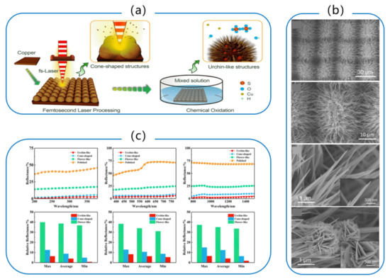 In 2017, Yao et al. [102] fabricated moth-eye microstructures and nanoparticle-covered laser-induced periodic surface structures (NC-LIPSS) on the surface of 304 stainless steel at different polarizations and energy densities via the femtosecond laser processing technique. The relationship between the size of the micro/nanostructures, laser energy density, and the orientation of NC-LIPSS and laser polarization were demonstrated. The laser-irradiated surface had better anti-reflection properties compared to pristine stainless steel. In 2021, Xu et al. [103] applied the femtosecond laser line scan technique to process parallel microgrooves with a period of 50 μm on the surface of aluminum alloy and obtained an anti-reflection performance of less than 5% in the spectral range of 200 to 1200 nm. In 2018, Fan et al. [104] applied the femtosecond laser direct writing technique into the fabrication of highly disordered super level micro/nanostructures on metallic copper surfaces, achieving an average hemispheric reflectance of 2.4%, 5.5%, and 6% in the wavelength ranges of 400–800 nm, 200–2000 nm, and 2.5–25 μm, respectively, with an average absorption of 94% within the range of 0.2–25 μm. In 2020, Liu et al. [105] proposed a femtosecond laser pretreatment combined with a chemical oxidation growth micro-nano fabrication strategy to prepare sea urchin-like composite micro/nanostructures on the surface of metallic copper, which exhibited excellent reflectance reduction and obtained ultra-low reflectance in an ultra-wide spectrum including UV, visible, IR, and far IR. In the UV band, the mean reflectance of the sea urchin-like array was merely 3.9% of that of polished copper, with a minimum value as low as 0.7%. The minimum reflectance in the visible band reached 5.3% of that of polished copper with a value fluctuation of less than 1%; while the minimum relative reflectance in the IR band was only 1.7%, indicating excellent and stable reflection reduction capability as shown in Figure 4. This chemical oxidation growth-assisted femtosecond laser processing strategy provides a simple method for fabricating micro/nanostructures combined with high homogeneity and reproducibility. The fabricated heterogeneous sea urchin-like structures can be employed as core functional progenitors in photovoltaic equipment, stealth materials, and chemical catalysis.