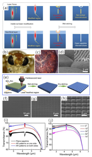 - Li, Q.K.; Cao, J.J.; Yu, Y.H.; Wang, L.; Sun, Y.L.; Chen, Q.D.; Sun, H.B. Fabrication of an anti-reflective microstructure on sapphire by femtosecond laser direct writing. Opt. Lett. 2017, 42, 543–546. [Google Scholar] [CrossRef]
