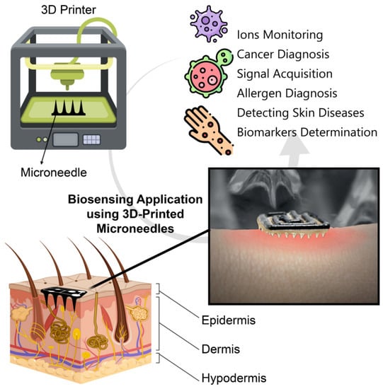 Integration of microneedle arrays (MNAs) with point-of-care (POC) biosensor technologies will provide new insights in biosensing applications. Taking advantage of emerging manufacturing method of 3D printing, MNA-integrated biosensors can be fabricated with customizable properties rapidly, resulting in biomedical applications such as monitoring different particles (for instance, biomarkers, and ions) and diagnosis of diseases (for instance, cancers, and allergies). The figure in the box was adapted from the journal cover photo of ref. [] with permission from John Wiley & Sons (2019).