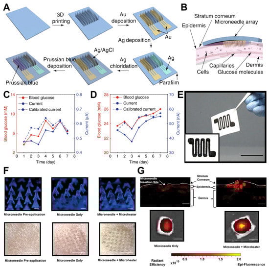 Also, a MN-based biosensor was designed for the continuous monitoring of ketone bodies, utilizing an electrochemical technique for detection of β-hydroxybutyrate (HB), as an indicator of ketones. The developed biosensor demonstrated sensitive selectivity for the detection of target molecules in the artificial interstitial fluid (ISF). It also presented the ability for the detection of HB besides glucose and lactate, which could be considered as a simultaneous MNA-based biosensor with the capability of sensing multiple biomarkers of diabetic ketosis []. Additionally, transdermal drug delivery has attracted the attention of physicians due to its promising advantages compared to oral administration, such as minimum side effects, gastrointestinal bleeding, and problems regarding liver metabolism. As a promising application, a 3D-printed microheater sensor-integrated MNA was designed for pain management in the patients with lower back pains []. A drug-encapsulated MN platform was integrated with a 3D-printed microheater for precise control of drug delivery in the injured area. A printing ink solution of multiwalled carbon nanotubes (MWCNTs) and polydimethylsiloxane (PDMS) was employed to microfabricate the microheater Figure 2E, and then it was capitalized on the back surface of the MNAs. The setup was used for the in vitro controlled release of the model drug of near-infrared fluorescence dye Cy5 in mouse skin (Figure 2F,G). The results of in vitro investigation drug delivery application of the developed platform facilitate a new way for application of MNA-integrated biosensing platforms in transdermal drug delivery and sensor-controlled medical systems.