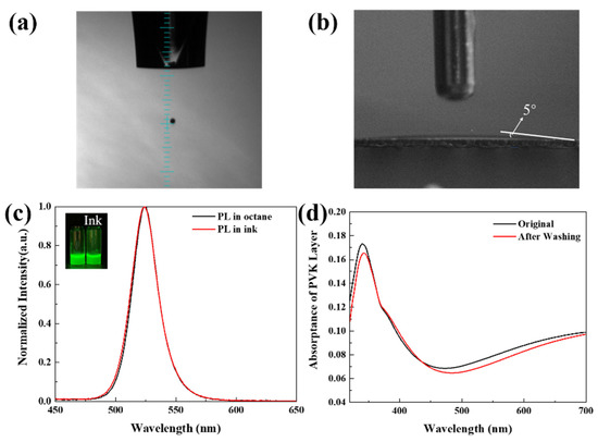 (a) Stable perovskite nanocrystal ink droplet existing from the nuzzle; volume of the droplet was around 60 pL; (b) contact angle of a perovskite nanocrystal ink drop on the PVK layer; (c) the PL spectra of the perovskite nanocrystal in octane and ink, with the inset showing the yellow-greenish images of the two samples under the excitation of 365 nm ultraviolet light; (d) ultraviolet–visible absorptance spectrum of initial and ink without perovskite nanocrystal washed PVK layer.