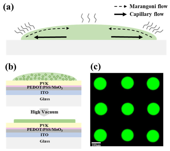 To fabricate a perovskite nanocrystal film of high quality via inkjet printing, the coffee-ring effect during evaporation of the solvent should be solved. As shown in Figure 2a, in the drying process of a single droplet on the substrate, the evaporation speed of solvent at the edge of the droplet is different from the evaporation speed in the center [34], and the solute (perovskite nanocrystal) flows to the edge via capillary flow to form a rough surface, which is called the coffee-ring effect. To suppress the coffee-ring effect, the balance between the capillary flow and Marangoni flow has been investigated in our previous work [31]. A high-viscosity ink causes a weak capillary flow, which can suppress the migration of nanocrystal to the edge. In our binary solvent ink, the introduction of octane adjusted the viscosity to an optimal value, corresponding to a Marangoni flow that would simply offset the capillary flow to suppress the coffee-ring effect, due to the surface tension gradience on the surface of the droplet [31,35,36], which is because of the difference in surface tension of octane and dodecane, as shown in Table 1. Meanwhile, according to a simulation conducted by Park et al. [34], the small contact angle of the droplet on the PVK layer also suppressed the coffee-ring effect, because the droplet with a smaller contact angle spread more widely, and the solvent evaporated faster under high-vacuum post-treatment. As shown in Figure 2b, we printed a perovskite dot array on a multilayer substrate, which was fabricated via spin-coating PEDOT: PSS and PVK with a MoO3 interface layer via thermal evaporation on the patterned ITO glass, and the fabricated substrate can be directly used for PeLED devices. After inkjet printing, the samples were transferred into a high vacuum (<10−4 pa) chamber to remove the solvent. After vacuum annealing for 20 min, the coffee-ring-free and uniform dots array was formed, with a diameter of about 150 μm, as shown in Figure 2c. Every single dot connected with the adjoining dots when the spacing was reduced, to form a pinhole-free and uniform perovskite film.