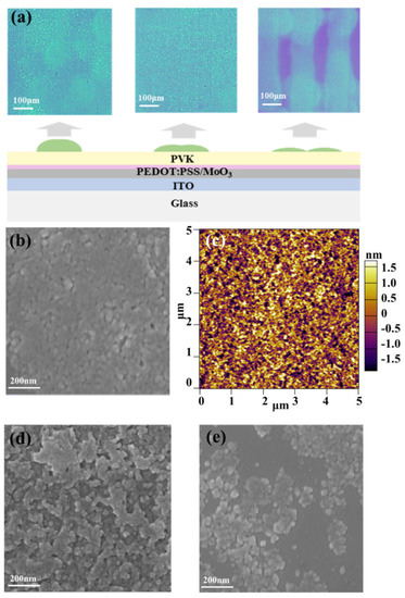 To obtain printable perovskite ink, the prepared perovskite nanocrystals were dispersed in a binary ink system (dodecane and octane) [31]. The viscosity and surface tension of these solvents are shown in Table 1. The main solvent of dodecane was used to achieve suitable viscosity for stable ink droplet formation and good dispersion for perovskite nanocrystals. As Figure 1a shows, a stable droplet without satellite dropped from the nuzzle, demonstrating the printability of perovskite nanocrystal ink. As reported in a previous study [23], a highly uniform printed film is crucial for multilayer LED devices. In inkjet printing, a small contact angle of ink on the substrate is required, as a large contact angle increases the difficulty of morphology control [17]. As shown in Figure 1b, the drop had a small contact angle of about 5° on the PVK layer, which results from the hydrophilic property of the main solvent used in the ink for PVK fabrication [33]. This benefits the formation of a uniform perovskite emission layer [34]. The comparison of PL spectra shown in Figure 1c proves that, compared with the original solution, the ink did not significantly affect the produced perovskite nanocrystal. The comparisons of TEM images of the dispersion of perovskite nanocrystal in the original solvent and ink are shown in Supplementary Figure S1, which proves the good dispersion of perovskite nanocrystals in the ink. Additionally, layer interference needs to be considered, where the underlying layer can be damaged by the solvent of the upper layer. The problem is more severe in inkjet printing, as the resting time of the solution is much longer than that in the spin-coating process. In the spin-coating process, a large proportion of solution is thrown away and quickly evaporated under high-speed rotation in less than 1 min. In inkjet printing, the evaporation time for the solution is more than 10 min. Considering the above issue, the toluene in our previous study [31] was replaced by octane to avoid the interference of toluene on the hole-transporting layer (PVK), which would cause serious layer interference between PVK and the emitting layer. To determine whether the composite-solvent ink would damage the underlying PVK layer, the absorptance of PVK was recorded after three times washing with a solution with the same composition of ink as that shown in Figure 1d. The absorptance spectrum showed little difference after washing with pure ink without perovskite nanocrystals. In short, the ink can be used to print a perovskite nanocrystal film on the PVK layer, which is the prerequisite for PeLED fabrication via inkjet printing.