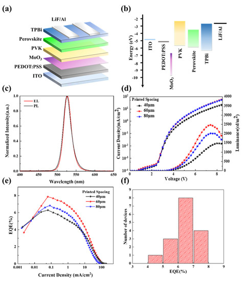 Printed PeLEDs were fabricated based on the perovskite films, with print spacing of 20, 40, 60, and 80 μm. The device schematic and band structure are shown in Figure 4a,b. The glass substrates with transparent ITO electrode patterns were used for PeLED fabrication due to the bottom-emitting device structure. The perovskite layer was sandwiched between other function layers including the 2,2′,2″-(1,3,5-Benzinetriyl)-tris(1-phenyl-1-H-benzimidazole) (TPBi, as the electron-transporting layer) and the PVK (as the hole-transporting layer), and the alumina as cathode, with 1 nm LiF modification, and indium tin oxide (ITO) as the anode. An ultrathin MoO3 layer was added between the PEDOT: PSS (served as a hole-injection layer) and the PVK acted as an electrical diploe layer. Due to the deep conduction band level of MoO3, a positive electric field could be formed across the PEDOT: PSS/MoO3/PVK, which can enhance hole injection and achieve a better charge balance in this device structure [36]. Figure 4c shows the pure PL and EL spectra with full width at half-maximum (FWHM) of 23 nm, and there was no emission from other function layers and interfaces, which means the recombination of electron and hole was limited inside the perovskite layer. The performance levels of devices with different printed steps are shown in Figure 4d,e. The comparison of spin-coating and inkjet printed devices performance are shown in Supplementary Figure S3. The key issue for achieving good performance in the device here is the quantity and thickness control of the inkjet-printed perovskite film. The thickness directly corresponds to the number of overlapped printed perovskite layers, and the thickness increases with the decrease in the print spacing. There are defects in perovskite nanocrystals [37], as well as at the interfaces between the emission layer and charge-transporting layers [13], which trap the charge and decrease the performance of these devices. A thicker perovskite layer has a relatively high tolerance for the interface trap, as there are more recombination zones, compared with a thinner perovskite layer, but the diffusing lengths (determined by traps of the perovskite nanocrystal) of carriers limit the increase in the thickness of emission layer. Therefore, when the spacing decreased from 80 to 40 μm, as shown in Figure 4d, the device presented a decreased current density due to the increased resistance with a thicker perovskite layer. Moreover, the perovskite film also became rougher with an increased thickness by overlapping multiple perovskite layers, and the excessively high roughness of perovskite film disabled the function of the EL device when the spacing decreased to 20 μm, as summarized in Table 3. When the spacing increased, as shown in Figure 3a, the perovskite film became discontinuous, thus causing current leakage, as shown in Supplementary Figure S4, and deteriorating the emitting performance of the device; therefore, the optimal spacing was determined as 60 μm, with the highest EQE of 7.9% and maximum luminance of 2465 cd/m2.