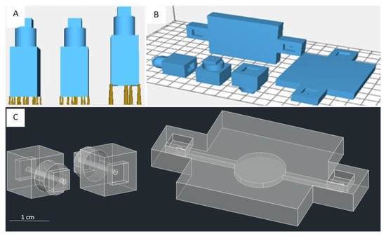 The fundamental connector block dimensions are shown in Figure 1C (left) and Figure 1C (center); they are 10 mm × 10 mm × 10 mm with a 2 mm × 5 mm × 5 mm lock and a cylinder with a radius of 8 mm and a length of 4 mm. The dimension of the fundamental chamber block in Figure 1C (right) is 30 mm × 30 mm × 5 mm, with the extension housing the lock structure having a dimension of 10 mm × 10 mm × 5 mm. The length of the inlet/outlet channels is 1 mm, connected to a 10 mm long channel with a 1.3 mm radius leading to the chamber. The diameter of the circle chamber is 6 mm. Other modules’ designs of connectors and chambers are shown in the Supplementary Materials (ESM, Figure S1).