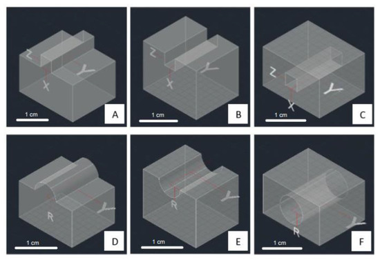 To evaluate the two parameters mentioned previously, we designed two shapes of the structure, square and circle, and combined them with the three style structures, embossed, debossed, and hollow, as displayed in Figure 2. These two groups (shape and style) were related to the exposure time and printing orientation. The structures were designed to increase in size gradually. The square shapes have side dimensions of 50, 100, 150, 200, 400, 600, 800, and 1000 µm (Figure 3A–C). The circle shapes have a diameter of 100, 200, 300, 400, 800, 1200, 1600, and 2000 µm (Figure 3D–F). The distance between each changing size of side or diameter in the structure is 3.25 mm. We tested the exposure time from 5–10 s, as it was still in the range of the recommended exposure time following the printer manufacturer’s instruction (ESM, Table S1). These two structures were evaluated based on the dimension limit when the printing parameters created the structure.