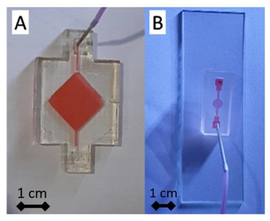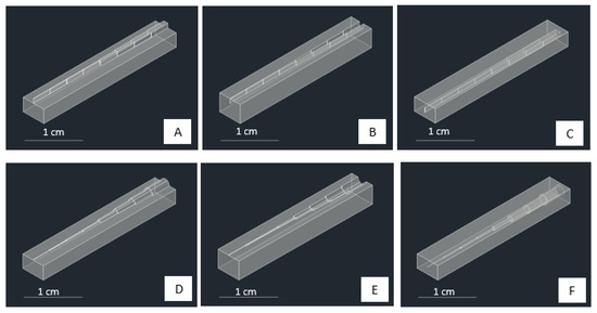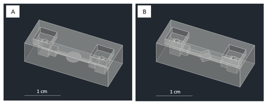 For the chamber module, we implemented two designs: flat and gradual. The former implies that the chamber inside, including the channels, is lined up on the same surface and of the same size (Figure 1C (right)), while the latter refers to the significant change in the channels’ size leading up toward the chamber (Figure 4). The dimensions for the fundamental chamber blocks in Figure 4A,B are 25 mm × 10 mm × 7 mm with an inlet of 1 mm. The gradual chambers’ dimensions are 3 mm × 3 mm × 3 mm, 2 mm × 2 mm × 2 mm, and 4 mm × 1 mm × Z mm, respectively, leading into the circle chamber (Figure 4A) of 4 mm diameter and diamond chamber (Figure 4B) with a diagonal length of 4 mm. Z mm is the dimension of channel height that we evaluated and targeted to reach a submillimeter scale.