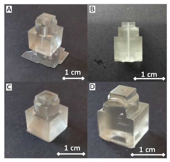 In contrast, printing the channel perpendicular to the build plate might also present a problem when dealing with observation chambers. The observation criteria need to have a clear surface, so the chambers are visible for observation. In bottom-up stereolithography, as layers are printed in a bottom-up direction, printing the chambers upright leaves the observing block quite translucent. To increase its transparency, the post-processing of the printed chamber module is noteworthy. Lastly, setting the suitable printing parameters shows its prominence in the fabricated modules’ results, as we noticed the failure in using the unfit setting of the printers (ESM, Figure S3D). For the fabrication of connector modules, we found that using the parameters from the default test model (ESM, Figure S2) added with a support structure and printed on vertical orientation gave successful printing results (Figure 5A,B), while non-supported design and horizontal printing orientation failed to fabricate the modules (Figure 5C,D). Therefore, we decided to reduce the layer height to the minimum setting (0.025 mm) of our connector set modules from the designs shown in Figure 1C (left and center) to minimize the risk of structural failures or channel collapsing if the build plate was drawn up (Z-direction) longer. The results are shown in the Supplementary Information (ESM, Figure S4), where we successfully printed six types of connector modules, from simple structures to complex structures.