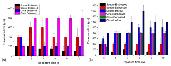 Furthermore, Figure 6A,B also showed that circle-embossed shapes could be formed up to 200 µm with the horizontal print orientation and exposure time of 6–10 s. For circle-debossed, the smallest dimension formed is 300 µm with a vertical orientation and an exposure time of 5 s. For the circle-hollow shape, the smallest dimension formed is 800 µm with a vertical print orientation and exposure times of 5 and 6 s. We considered that the horizontal approach was not suitable for fabricating a hollow structure, contrasted with using a vertical orientation, where a minimum dimension can be printed up to 600 µm (vertical, square, hollow) and 800 µm (vertical, circle, hollow), presumably due to the uncured resin that remained in the channel. In the open-area printing case (embossed and debossed styles), we can see from Figure 6 that all structures could be printed up to a submillimeter scale. This condition is different from hollow structures because printing in an open environment design allows the uncured resin to be released or removed from the printing block during the printing process. Table 1 summarizes the best condition for obtaining the desired shape and style. Further evaluation of different structures may find the different optimum conditions that are also interested in further exploration.