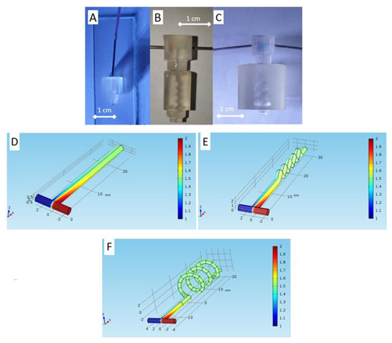 Flow observation on modular blocks. (A) Straight connector module, (B) T-channel with zig-zag connector module, and (C) T channel with spiral connector module. Simulation study for functional mixer connector using plasma blood sample (concentrations 1 and 2 mol/m3) for designed T channel (D) without mixer (E) with zigzag mixer, and (F) with spiral mixer.