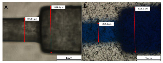 The blocks had hydrophilic characteristics when a simple droplet test was conducted to determine the modules’ surface characteristics (ESM, Figure S6, Table S2). Therefore, the fluidic modules might serve as an alternative for oil-in-water droplet tests and other tests that require a hydrophilic medium [35]. Next, we tested two printing orientations and evaluated whether the surface hydrophilicity would change upon receiving a longer exposure time. From the results, we observed no distinct surface hydrophobicity change, and the surface remained hydrophilic, even at the maximum exposure time recommended by the 3D printer’s manufacturer (ESM, Figure S6, Tables S1 and S2). Additional observation through a confocal microscope was conducted to measure the dimensions of the printed module (Figure 8). Based on the direct measurement in Figure 8A, the bigger channel’s width was 2094.0 µm, and the smaller channel’s width was 1064.1 µm. Compared to the original design with 2000 µm of the channel width, there was a slight deviation of 94 µm or about 4.701% error in dimension. However, the direct measurement is prone to human error, as the object of interest has thick edges and is not perfectly transparent.