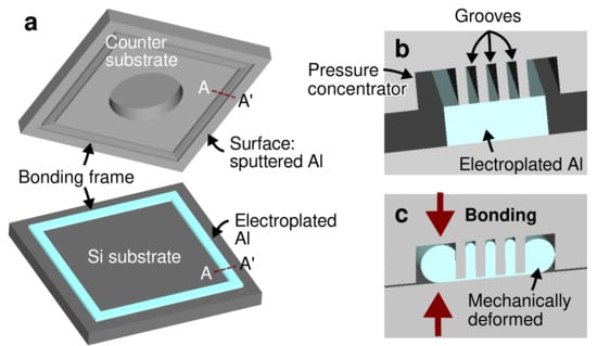(a) Schematics of the test vehicle consisting of a Si substrate with electroplated Al and a counter substrate with grooves as the bonding frames. Enlarged schematics of the bonding interface cross-section A-A’ in-contact (b) before and (c) after the bonding process.