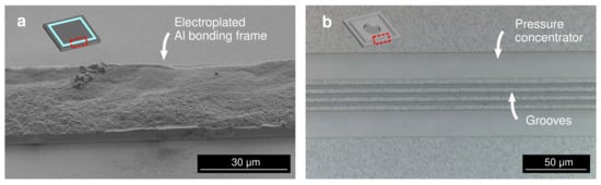 To compensate the surface roughness of the electrochemically deposited metallic bonding frames, a pressure concentrating structure at the counter wafer can also be utilized [27,28]. A high localized pressure by groove structure at the counter wafer induces a large mechanical deformation, which can also be utilized to intentionally break the native oxide of the electrochemically deposited bonding frame, i.e., press marking.