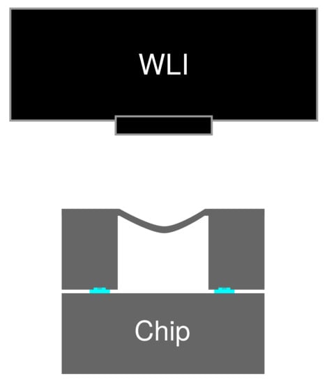 Along and after the process, the samples were optically observed using an optical microscope (DM4000M, Leica Camera AG, Wetzlar, Germany) and a scanning electron microscope (SEM, SU-70, Hitachi Ltd., Tokyo, Japan). The pressure of the sealed cavity was measured utilizing the 10 µm-thick diaphragm of the wafer bonding test vehicle. The deformation of the diaphragm membrane was measured by a white light interferometry surface topography measurement system (MSA-500, Polytec GmbH, Waldbronn, Germany). The schematics of the evaluation setup is illustrated in Figure 4. The sealed cavity pressure was estimated according to the deflection of circular membrane theory [40]. The deflection of a circular plate, , is proportional to the pressure difference between its opposing sides, and can be mathematically represented as,