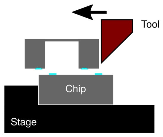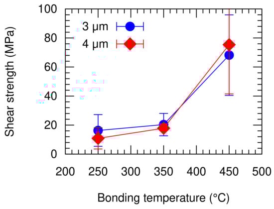The bonded substrates were then diced to single chips. Then, a die shear strength tester (PTR-1101, Rhesca Co., Ltd., Tokyo, Japan) was used to evaluate the bonding strength of the bonded chips. The test was performed by fixing one of the bonded substrates while pushing the other substrate in the horizontal direction. The fracture force was recorded during the experiment. The schematics of the evaluation setup is illustrated in Figure 5. The fracture surface was then observed using a SEM. The shear strength, , was determined from the fracture force, , and the projection of the bonding area, A, as