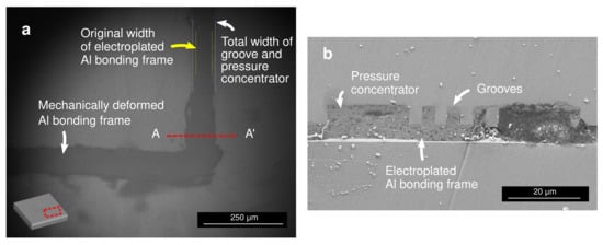 Figure 6a displays the infrared micrograph taken from above the bonding frame after the bonding process. In the infrared wavelength Si is transparent, which enabled the observation of the mechanically deformed Al bonding frame through the Si substrate. The cross-sectional scanning electron micrograph around the bonding frame is shown in Figure 6b. These observations validated the proposed bonding mechanism, in which the electroplated Al bonding frame was mechanically squeezed to penetrate into the grooves. During the mechanical squeezing process, fresh pure Al surface emerged at the bonding interface, which enabled the atomic interdiffusion at the low temperature.