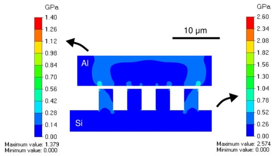 The bonding mechanism is analyzed by a finite element analysis using a commercially available software Femtet (Murata Software Co., Ltd., Yokohama, Japan). The initial contact between the electroplated Al bonding frame and the grooves at the opposing wafer is simulated using the available 2-dimensional stress analysis solver. The model size is exactly the same as the experimental bonding test vehicle, with the exception of the Si substrate thickness, which was reduced to reduce the computational load. The simulation was carried out using triangular mesh of 0.1 µm size. Convergence was confirmed under these conditions. The mechanical properties of the electroplated Al are in accordance to previous studies, the elastic modulus was 77 GPa and the Poisson’s ratio was 0.34 [37,38]. The material properties of the grooves are those of the single crystalline Si.