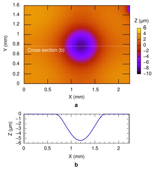 Hermeticity of a bonded package is an important parameter which determines the long-term quality of a MEMS device. The vacuum sealing of the technology was evaluated by measuring the sealed cavity pressure using the deflection of the diaphragm at the counter substrate in the bonding test vehicle. The typical deflection profile of the diaphragm under the atmospheric pressure is depicted in Figure 8. The measurements were performed 2 h after the bonding experiment. A maximum deflection of around 5 µm was obtained from the cross-section, as shown in Figure 8b. The sealed cavity pressure was estimated accordingly as around 59–88 kPa, for all bonding conditions. Higher vacuum sealing might be possible by introducing a heat pre-treatment prior to the bonding process and/or a thin film getter material inside the bonded packages [25,41]. For a more precise sealed cavity pressure evaluation, the diaphragm can be subjected to the zero-balance method [42]. In the zero-balance method, the deformation of the diaphragm is measured inside a pressure-controllable vacuum chamber at different pressures. The cavity pressure is identical to the chamber pressure when the diaphragm becomes flat. However, in this study, the zero-balance method was not performed due to the high sealed cavity pressure, which voids the necessity of precise sealed cavity pressure measurement. Other cavity pressure measurement methods include the fabrication of a resonator [43,44] or a micro-pirani gauge [45,46,47]. The value of the sealed cavity pressure was then translated to the leak rate of less than 3.8 Pa m3 s−1, regardless of the bonding condition.
