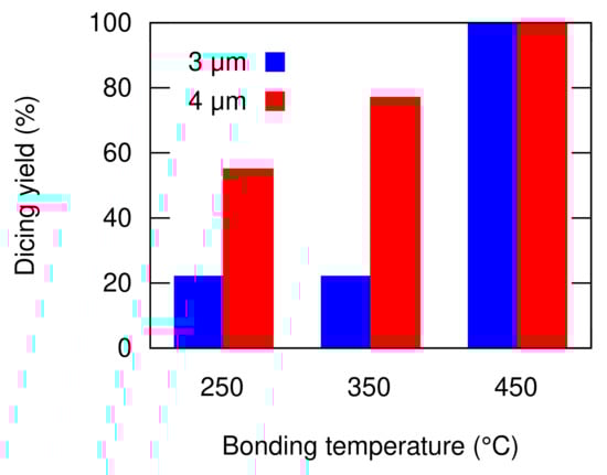 After the bonding process, the bonded substrates were diced to single test vehicle chips. The dicing process often induces shear stress to the bonded package. The stress causes the bonded packages with low quality to peel-off. Therefore, the survival ratio of the bonded packages after the dicing process reflects the bonding quality. The dicing yields of the bonded packages with 12 different conditions are depicted in Figure 9. For each condition, 9 chips were prepared. The dicing yield at 450 C bonding temperature was 100% for all the design parameters. This indicates that the diffusion between the bonding surfaces occurred sufficiently to realize a high reliability bonding interface. The temperature is also the typical bonding temperature for Al thermocompression bonding [16,17]. The overall dicing yield decreases with the bonding temperature. This indicates that the bonding quality deteriorates with the decrease in the bonding temperature.