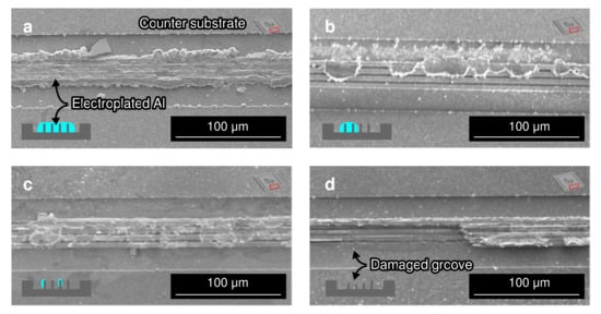Figure 11a shows the typical fracture surface of the packages bonded at 450 C bonding temperature. At such a high bonding temperature, a relatively high bonding strength for all conditions regardless of the groove design. The typical fracture surface was at the bulk electroplated Al. These results confirm that the weakest part of the bonded package was not the bonding interface, which suggests an adequate atomic interdiffusion between the electroplated Al and sputter-deposited Al on the counter substrate at the bonding interface. In addition, the fracture surface also indicates that the electroplated Al bonding frame was squeezed and penetrated inside the grooves. The amount of electroplated Al penetrated into the Si groove also contributed to enhance the bonding strength. The lateral spread of the Al bonding frame was 30–40%. According to the observation, the bonding frames were squeezed from 30 µm to around 40 µm.