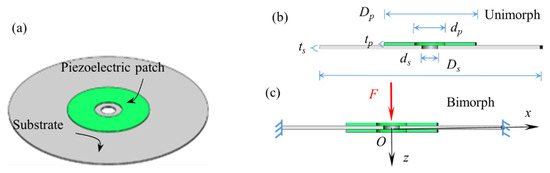 Set-up of a piezoelectric coupled disc (PCD). (a) 3D view of PCD; (b) normal section view of unimorph PCD; (c) normal section view of bimorph PCD.