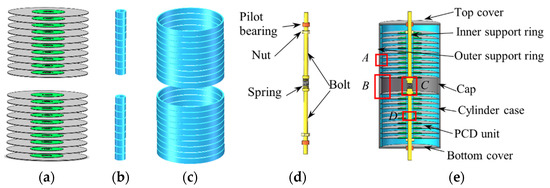 Set-up of a piezoelectric damper. (a) PCD array; (b) inner support ring array; (c) outer support ring array; (d) load transfer unit; (e) section view of piezoelectric damper.