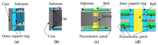 The structure design and working mechanism of the new type of piezoelectric damper are displayed in Figure 1, Figure 2 and Figure 3. The PCD is an aluminum alloy substrate disc bonded with one/two concentric circular piezoelectric patch of PZT4 (Lead Zirconate Titanate) by epoxy resin (shown in Figure 1a). The normal section of unimorph PCD is displayed in Figure 1b, in which a PZT4 patch with an inner diameter of dp, an outer diameter of Dp and a thickness of tp is pasted on one surface of the concentric substrate disc. The normal section of bimorph PCD is revealed in Figure 1c, in which two PZT4 patches are pasted on the two surfaces of the concentric substrate disc with an inner diameter of ds, an outer diameter of Ds and a thickness of ts. In this experiment, the array of PCDs shown as Figure 2a has the actions of a damper and spring, and can absorb and transfer part of the vibration energy from the outer excitation into electric energy to attenuate the outer vibration. It is obvious that two arrays of PCDs shown in Figure 2a need to match two arrays of inner supporting rings shown in Figure 2b, two arrays of outer supporting rings shown in Figure 2c, and a load transfer unit shown in Figure 2d to form a piezoelectric damper shown in Figure 2e. The inner and outer support rings are used to isolate the PCDs and fix them in an array, which can be seen in Figure 2e. The load transfer unit is composed of two pilot bearings, two nuts, a spring, and two bolts. The pilot bearings, inlaid in the concentric holes of the top and bottom covers, can make the bolts just move in the axial direction and reduce the friction between bolts and covers. Two pairs of nuts on the bolts are used to make the array of PCDs move with the bolts. The installation of these components is displayed in Figure 2e. The outer support rings are in contact with the inner surface of the cylinder case shown in Figure 3a. The PCDs are isolated by inner and outer support rings and restricted by the cap (Figure 3b), the covers and the nuts. The outer excitation is exerted on the array of PCDs through the load transfer unit. The axial displacement of the bolts is restricted in a range by the spring (Figure 3c) connecting the two bolts, which can protect the PCDs to avoid broken. The inner support ring shown in Figure 3d circles around the bolt and make PCDs has a uniform deformation in the move of the bolts.