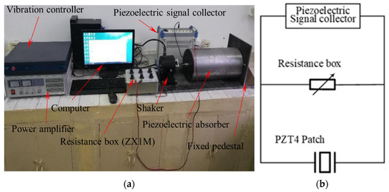 The experiment setup and electric circuit of the piezoelectric damper. (a) experiment setup; (b) electric circuit.