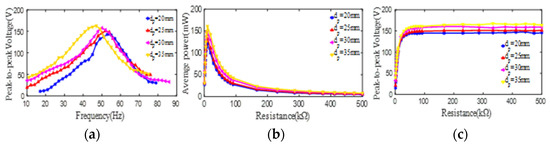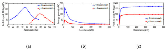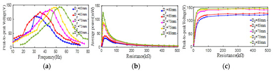 The effect of the outer diameter of the PZT4 patch on its peak-to-peak voltage and average power. (a) peak-to-peak voltage versus excitation frequency; (b) average power versus load resistance; (c) peak-to-peak voltage versus load resistance.
