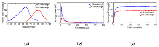 The effect of the substrate thickness on the peak-to-peak voltage and average power of one PZT4 patch bonded on the substrate. (a) peak-to-peak voltage versus excitation frequency; (b) average power versus load resistance; (c) peak-to-peak voltage versus load resistance.
