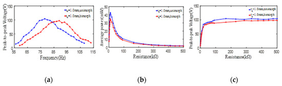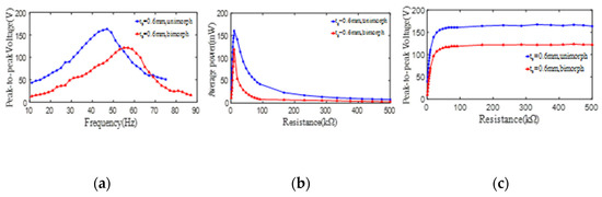 The effect of unimorph PCD and bimorph PCD on the output peak-to-peak voltage and average power of one PZT4 patch (ts = 1 mm). (a) peak-to-peak voltage versus excitation frequency; (b) average power versus load resistance; (c) peak-to-peak voltage versus load resistance.