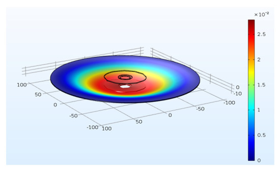 In order to comprehensively research the effects of the inner/outer diameter and the thickness of the PZT4 patch and the substrate thickness on the energy harvesting behavior of the PCDs, more PCD models with different dimension are built by COMSOL software. To visually display the stress distribution of the PCD under the axial force, the stress contours of the PCD are simulated by COMSOL software and revealed in Figure 11. It can be intuitively found that the deformation focuses on the area bonding PZT4 patch and its neighborhood. In addition, to verify the accuracy and the reliability of the COMSOL models, the peak-to-peak voltages of the experimental models of 2#–4# PCDs are simulated by corresponding COMSOL models. The results from experiments and simulations are extracted and shown in Figure 12. It can be found from Figure 12 that the curves of the peak-to-peak voltages from the simulation are roughly the same as those from the experiment, which can be seen in Figure 12a–c for 2#, 3#, and 4# PCD, respectively. These phenomena indicate that the simulation models of PCDs are reliable and the simulation results of the voltages of PCDs are accurate. Therefore, using COMSOL software to extend the research of PCDs with more dimensions is feasible. Just to be clear, in the following description, the size parameters of PCDs with star mean the simulation models. For example, Dp* denotes the outer diameter of the PZT4 patch for COMSOL simulation models.