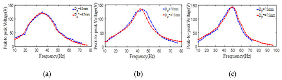 The relationship curves of the peak-to-peak voltage and the excitation frequency of the unimorph PCD from experimental results (blue line) and simulation results (red line). (a) peak-to-peak voltage of PCD with Dp = 65 mm; (b) peak-to-peak voltage of PCD with Dp = 70 mm; (c) peak-to-peak voltage of PCD with Dp = 75 mm.