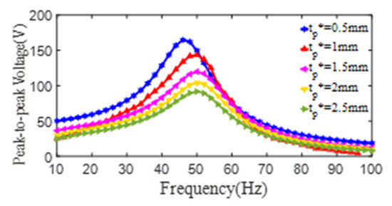 The relationship curves of the peak-to-peak voltage and the excitation frequency of PZT4 patch with different thickness (dp* = 20 mm, Dp* = 75 mm, ts* = 0.6 mm).