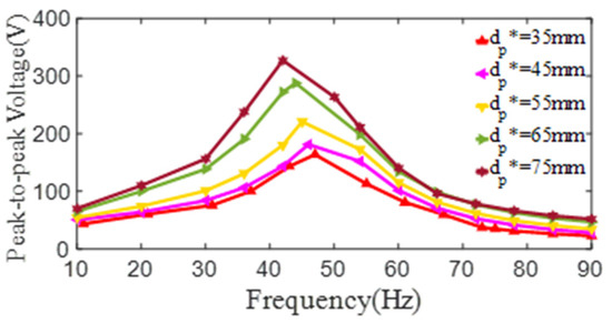To expand the study on the relationship of the inner diameter of the PZT4 patch and the output voltage of the PCD, a series of simulation models of the damper are modeled, in which the substrate discs are bonded by PZT4 patches with different inner diameters. In these simulations, the dimensions of PZT4 patch and substrate are set to be Dp* = 80 mm, tp* = 1 mm, ts* = 0.6 mm, ds* = 15 mm, and Ds* = 218 mm. It can be obtained from Figure 15 that the maximum peak-to-peak voltages and the 1st resonant frequency are (163 V, 47 Hz), (181 V, 46 Hz), (221 V, 45 Hz), (288 V, 44 Hz), and (327 V, 42 Hz), when the inner diameter dp* of the PZT4 patch increases as 35 mm, 45 mm, 55 mm, 65 mm, and 75 mm, respectively. Obviously, with the increase of the inner diameter, the peak-to-peak voltage increases. This phenomenon is caused by the decrease of the bending rigidity of the PCD, which further causes the increases of the surface strain and the output voltage of the PZT4 patch. Another finding is that with the increase of the inner diameter, the 1st resonant frequency of the PCD keeps a continuous decrease. This is the same as the rule in experiments and for the same reason as experiments.