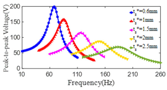 The effect of the substrate thickness on the output voltage of the PCD is also further researched by the simulation method. In this computation process, the parameters are taken as dp* = 80 mm, Dp* = 135 mm, tp* = 1 mm, ds* = 15 mm, and Ds* = 218 mm; and the substrate thickness is changed from 0.6 mm to 2.5 mm. As displayed in Figure 16, when the substrate thickness of ts* is rising to 0.6 mm, 1.0 mm, 1.5 mm, 2.0 mm and 2.5 mm, the maximum peak-to-peak voltage from the PZT4 patch is 201 V at 65 Hz, 163 V at 82 Hz, 121 V at 115 Hz, 91 V at 150 Hz and 71 V at 180 Hz, respectively. From the data above, it can be founded that as the thickness of the substrate increases, the 1st resonant frequency of the PCD increases markedly, but the peak-to-peak voltage at this frequency decreases. Obviously, with the increase of its substrate thickness, the bending stiffness and the natural frequency of the PCD increases. Another key reason is that the excitation amplitude of the shaker decreases with the increase of its excitation frequency, which also leads to the decreases of the deformation and the generated voltage (at 1st resonance) of the PZT4 patch of the PCD with a bigger substrate thickness.